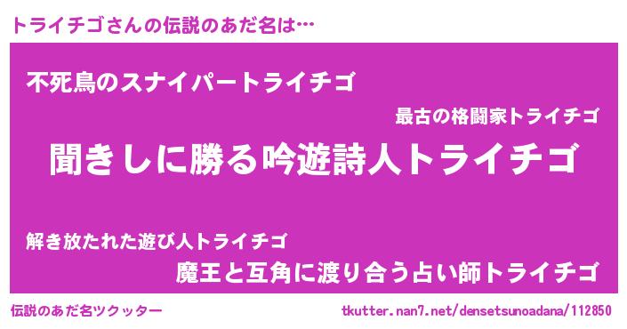 | 意味不明あだ名 | 『住所不定無職トライチゴ(3歳)』 |