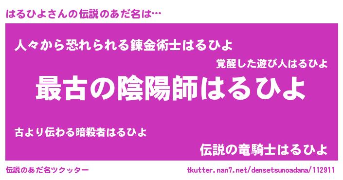 | 女子向けラノベタイトル風あだ名 | 『はるひよ伯爵の花嫁』『はるひよ恋絵巻』 |