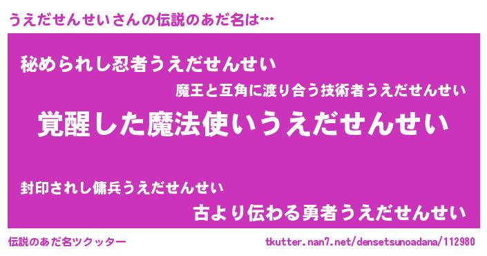 | ヒーロー風カッコイイあだ名 | 『炎刃騎士ウエ』『ネオウエダセンセイ』 |