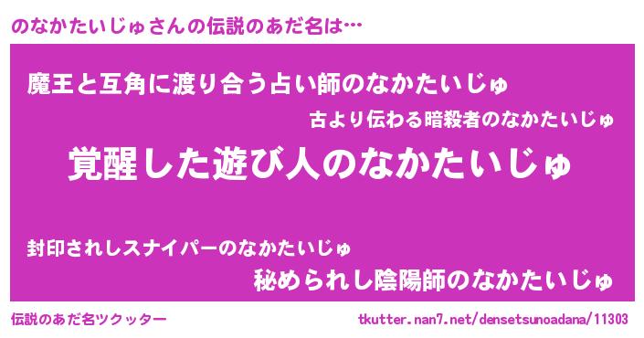| 男性向けラノベタイトル風あだ名 | 『のなかたいじゅ~年齢イコール彼女いない歴の魔法使い~』 |
