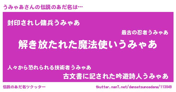 | 男性向けラノベタイトル風あだ名 | 『ダンジョンにうみゃあを求めるのは間違っているだろうか』 |