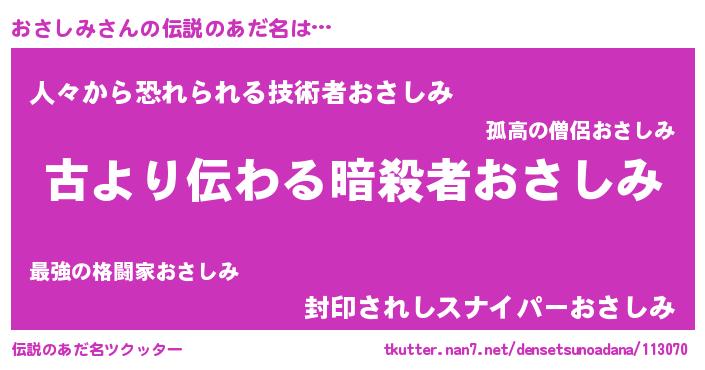 | 意味不明あだ名 | 『なめこ科おさしみ属』『自称おさしみ』 |