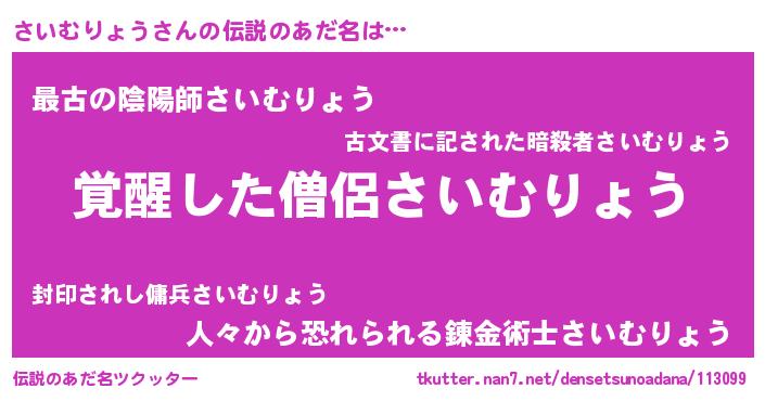 | 男性向けラノベタイトル風あだ名 | 『さいむりょう~年齢イコール彼女いない歴の魔法使い~』 |