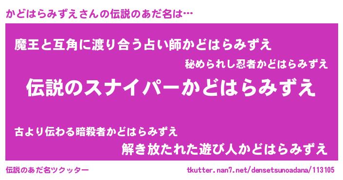 | 肩書あだ名 | 『かどはらみずえ上級大将』 |