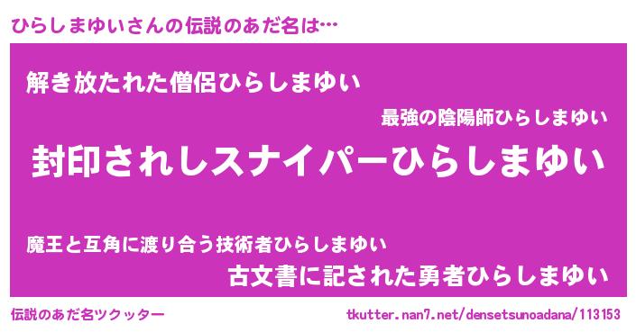 | 胡散臭い通販商品みたいなあだ名 | 『億万長者になれる霊験あらたかなお札…その名も「ひらしまゆい」』 |