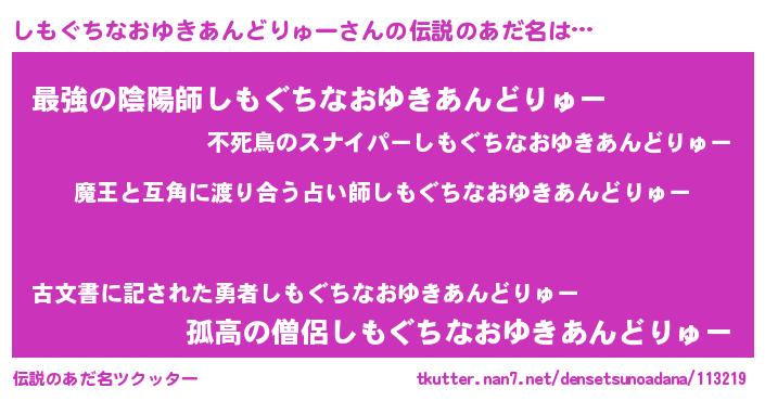 | 男性向けラノベタイトル風あだ名 | 『魔弾の王としもぐちなおゆきあんどりゅー』 |