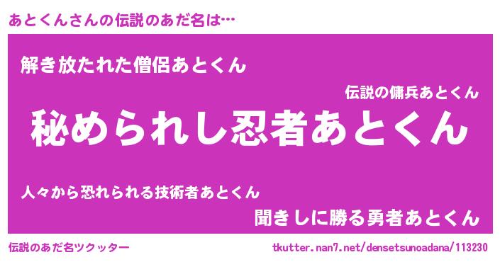 | ヒーロー風カッコイイあだ名 | 『ウルトラあとくんマン』『銀牙騎士アト』 |