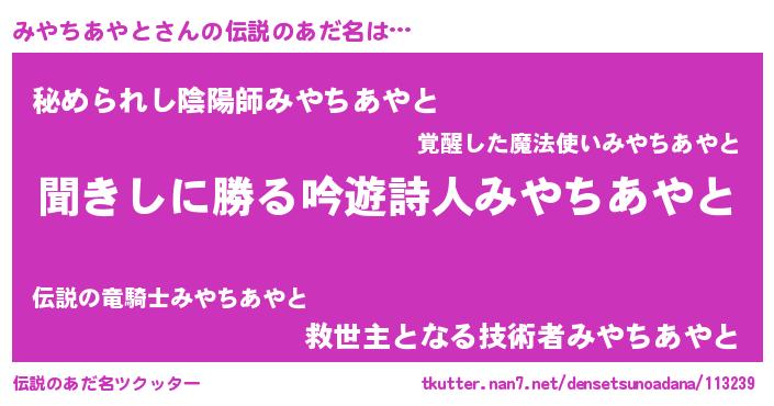 | 男性向けラノベタイトル風あだ名 | 『みやちあやとという概念が存在しない退屈な世界 』 |