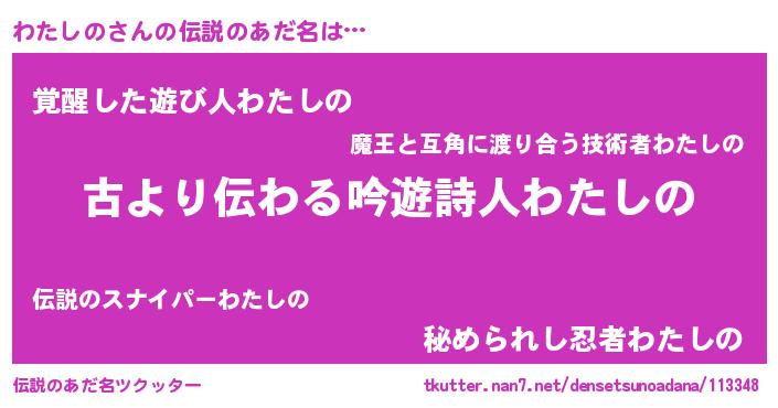 | ヒーロー風カッコイイあだ名 | 『ネオワタシノ』『天弓騎士ワタ』 |