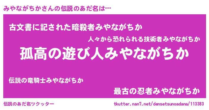 | ヒーロー風カッコイイあだ名 | 『暗黒騎士ミヤ』『ネオミヤナガチカ』 |