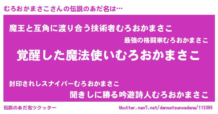 | 男性向けラノベタイトル風あだ名 | 『むろおかまさこの嫁は女の子じゃないと思った?』 |