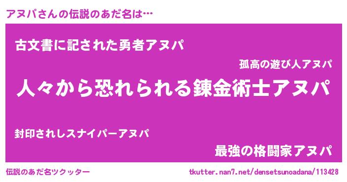 | 意味不明あだ名 | 『めかぶ科アヌパ属』『永久保存アヌパ』 |
