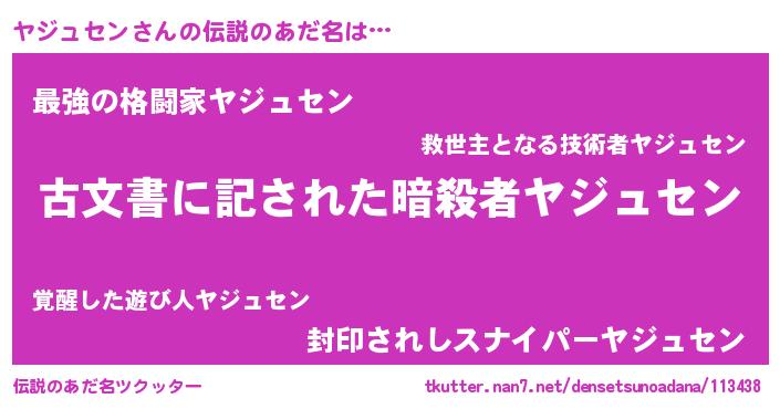 | 男性向けラノベタイトル風あだ名 | 『Re:ヤジュセンから始める異世界生活』 |