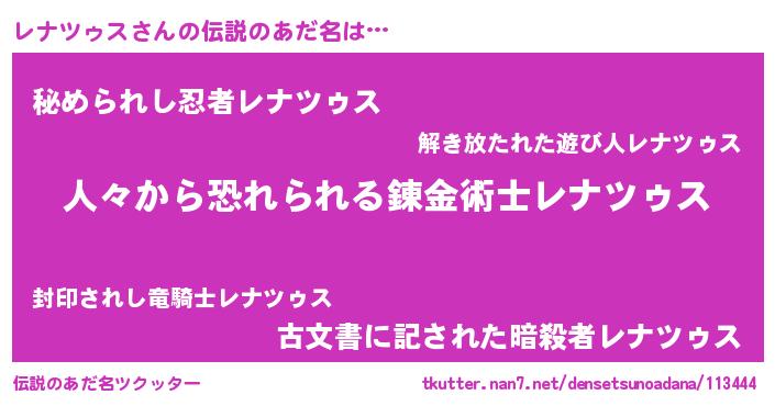 | ヒーロー風カッコイイあだ名 | 『正義の使者レナツゥス』『天弓騎士レナ』 |