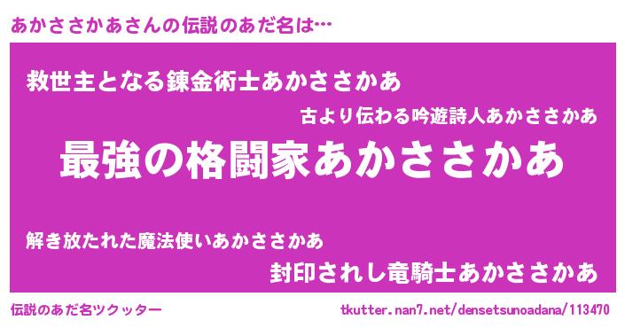 | 男性向けラノベタイトル風あだ名 | 『あかささかあ~年齢イコール彼女いない歴の魔法使い~』 |