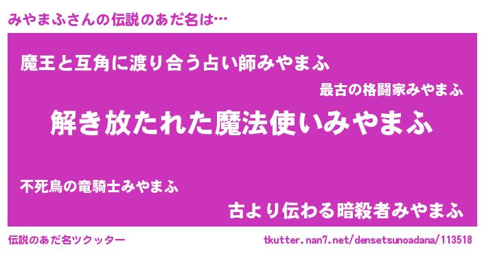 | 男性向けラノベタイトル風あだ名 | 『みやまふの嫁は女の子じゃないと思った?』 |