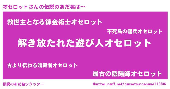 | 男性向けラノベタイトル風あだ名 | 『ダンジョンにオセロットを求めるのは間違っているだろうか』 |