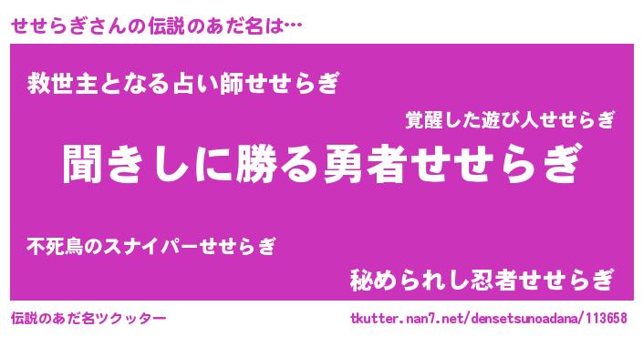 | 胡散臭い通販商品みたいなあだ名 | 『絶対に幸福をもたらす水素水…その名も「せせらぎ」』 |