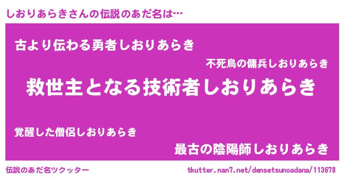 | ヘコむあだ名 | 『しおりあらき(小並感)』『つくし』 |