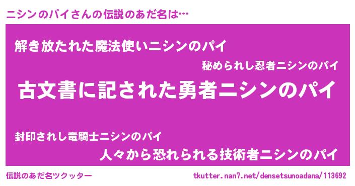 | ヒーロー風カッコイイあだ名 | 『ネオニシンノパイ』『暗黒騎士ニシ』 |
