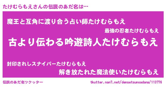 | ヘコむあだ名 | 『たけむらもえ(小並感)』『たけ太郎』 |