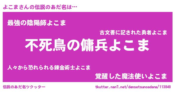 | 女子向けラノベタイトル風あだ名 | 『よこま姫と円卓の騎士』 |