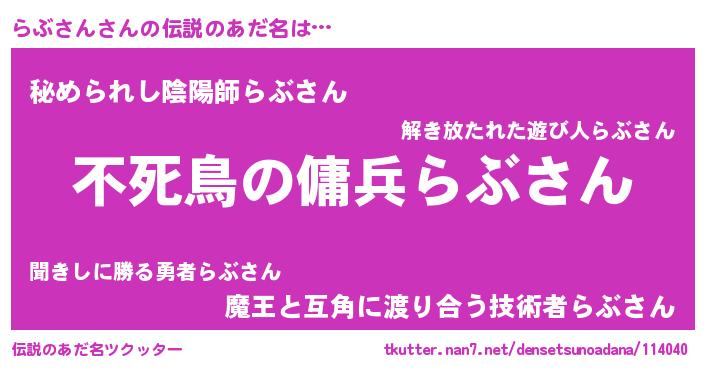 | 男性向けラノベタイトル風あだ名 | 『Re:らぶさんから始める異世界生活』 |