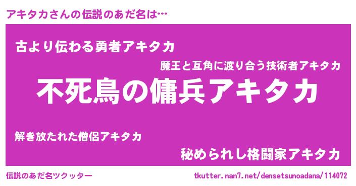 | 男性向けラノベタイトル風あだ名 | 『アキタカアートオンライン』 |