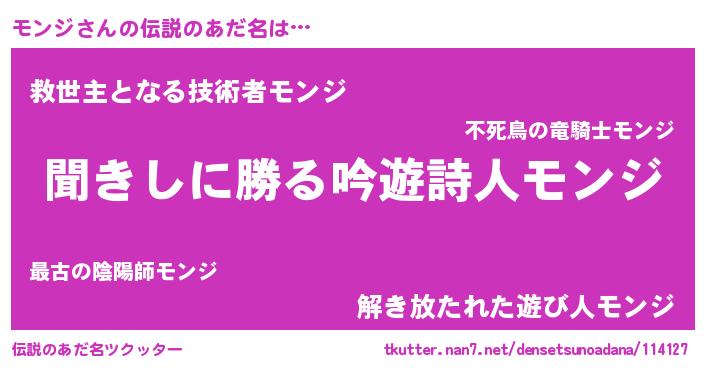 | ヒーロー風カッコイイあだ名 | 『ネオモンジ』『慈愛の使者モンジ』 |