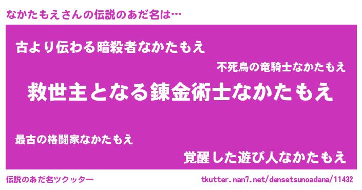 | ヒーロー風カッコイイあだ名 | 『天空の使者なかたもえ』『炎刃騎士ナカ』 |