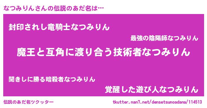 | 男性向けラノベタイトル風あだ名 | 『Re:なつみりんから始める異世界生活』 |