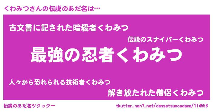 | ヒーロー風カッコイイあだ名 | 『ウルトラくわみつマン』『仮面クワダー』 |