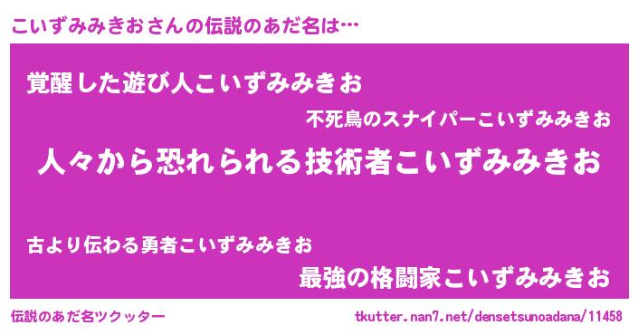 | 女子向けラノベタイトル風あだ名 | 『こいずみみきお夫妻のなれそめ』 |