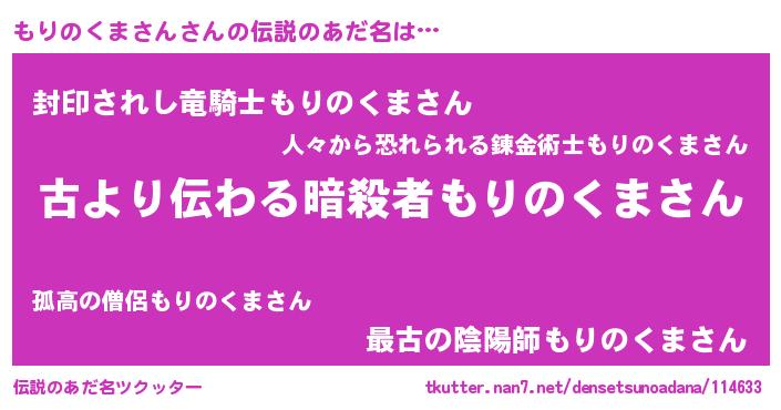 | 胡散臭い通販商品みたいなあだ名 | 『来世でも幸せになれる健康食品…その名も「もりのくまさん」』 |