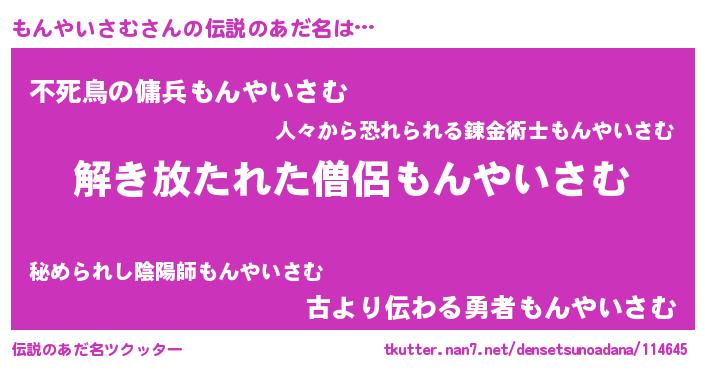 | 女子向けラノベタイトル風あだ名 | 『もんやいさむの卵を拾いまして』 |