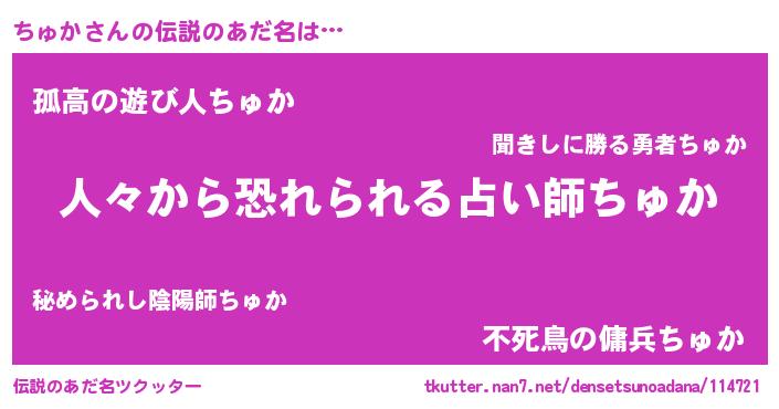 | ヒーロー風カッコイイあだ名 | 『正義の使者ちゅか』『暗黒騎士チュ』 |