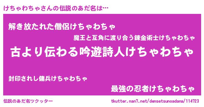| 男性向けラノベタイトル風あだ名 | 『けちゃわちゃという概念が存在しない退屈な世界 』 |