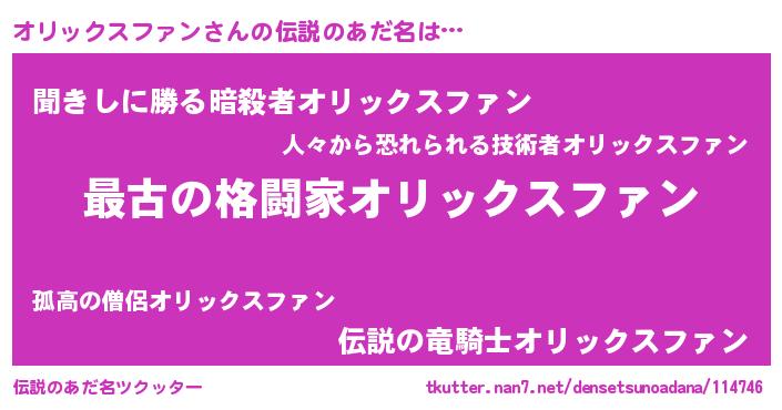 女子向けラノベタイトル風あだ名 | 『オリックスファンの玉の輿計画!』 |