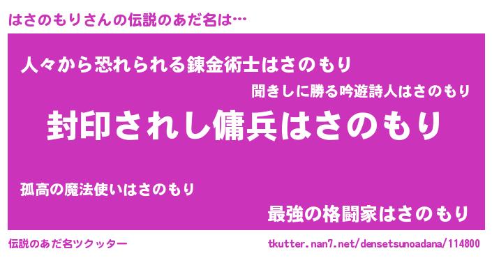 | 男性向けラノベタイトル風あだ名 | 『Re:はさのもりから始める異世界生活』 |