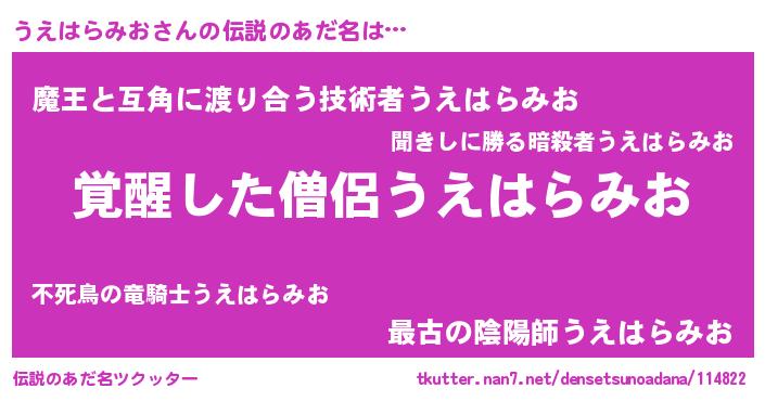 | 男性向けラノベタイトル風あだ名 | 『うえはらみおの嫁は女の子じゃないと思った?』 |