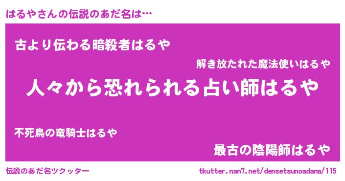 | ヒーロー風カッコイイあだ名 | 『正義の使者はるや』『ネオハルヤ』 |