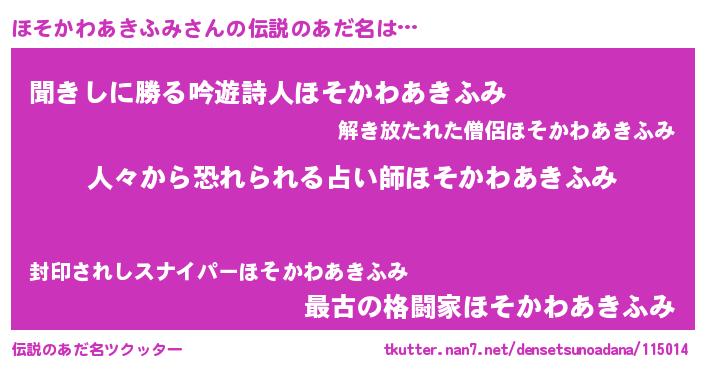 | ヘコむあだ名 | 『ほそかわあきふみ(笑)』『酢こんぶ』 |
