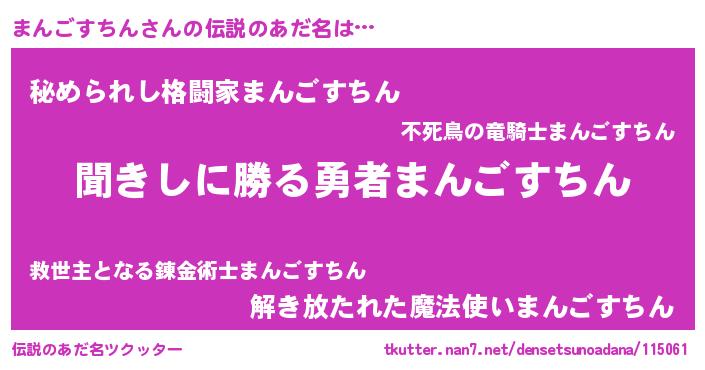 | 胡散臭い通販商品みたいなあだ名 | 『絶対に幸福をもたらす水素水…その名も「まんごすちん」』 |