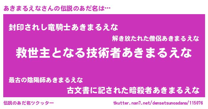 | 男性向けラノベタイトル風あだ名 | 『あきまるえなに滅ぼされるだけの簡単なお仕事です』 |