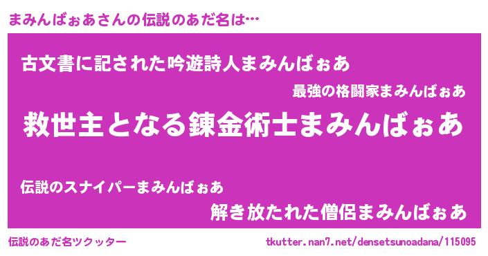 | 男性向けラノベタイトル風あだ名 | 『Re:まみんばぉあから始める異世界生活』 |