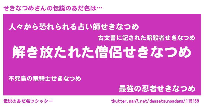 | 男性向けラノベタイトル風あだ名 | 『せきなつめに滅ぼされるだけの簡単なお仕事です』 |