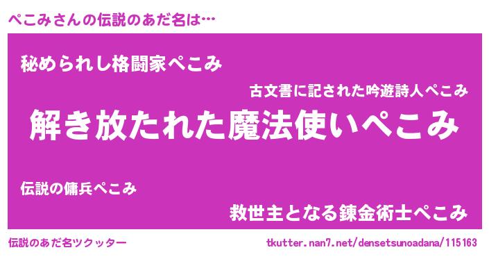 | 意味不明あだ名 | 『もやし科ぺこみ属』『自称ぺこみ』 |