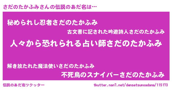 | 男性向けラノベタイトル風あだ名 | 『おまえをオタクにしてやるから、俺をさだのたかふみにしてくれ! 』 |
