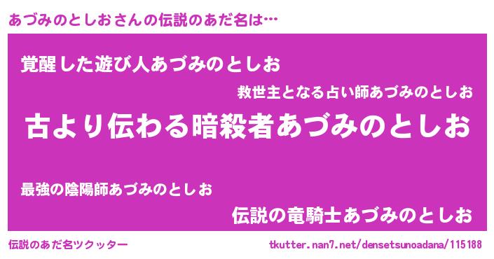 | 男性向けラノベタイトル風あだ名 | 『Re:あづみのとしおから始める異世界生活』 |