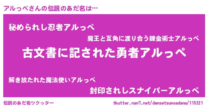 | ヒーロー風カッコイイあだ名 | 『究極戦士アルッペ』『ネオアルッペ』 |